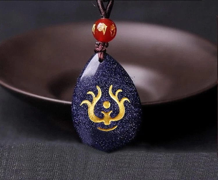 The necklace is made with a teardrop Dark Blue semi-precious Sandstone, engraved and enameled with the reproduction of the original symbol.